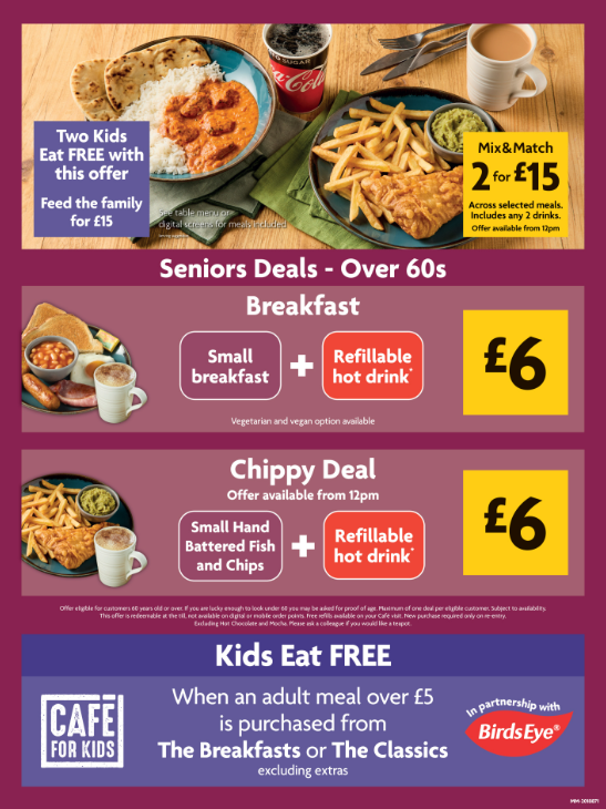 This is available for all over 60s! A Small Breakfast and any refillable Hot drink* for only £6. Or from 12pm onwards treat yourself to our cracking chippy deal. This is available all day every day in our Cafes.